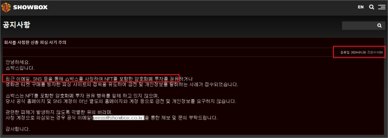 쇼박스도 관련해서 1월 26일에 회사를 사칭한 신종 피싱 사기 주의 라는 공지글을 작성했네요.