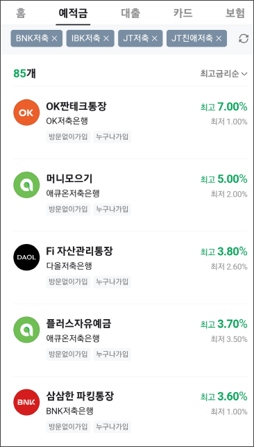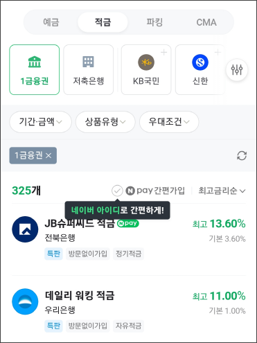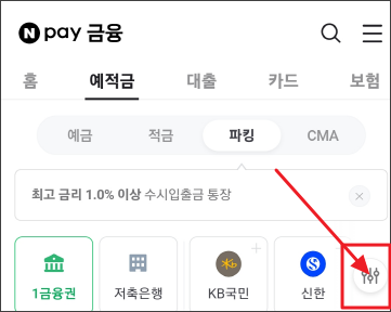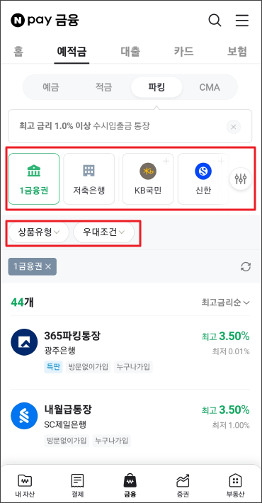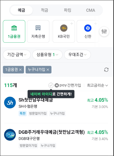 예금, 적금, 파킹, CMA까지 금리별로 조회가 가능해서 너무 좋은 거 있죠.