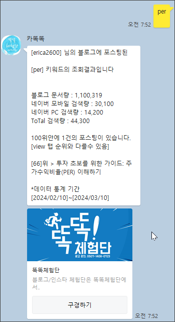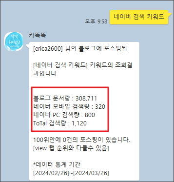 두번째, 카.카.오.톡의 카.똑.똑을 이용해서 발행한 포스팅의 순위를 체크하여 잘못된 블로그 제목이나 키워드 정보들을 수정합니다.