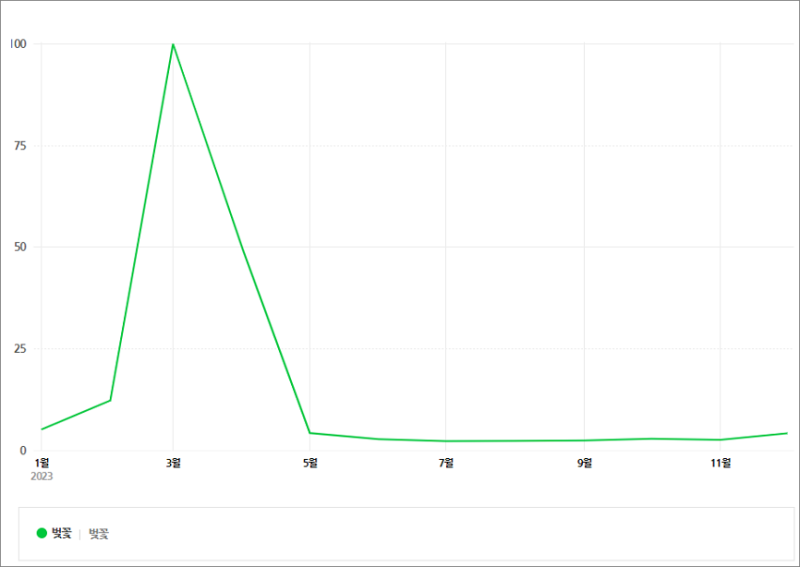 아래와 같이 벚꽃은 2월에 검색량이 늘고 3월에 최절정 그리고 4월~11월까지는 검색량이 줄어드는 걸 확인할 수 있어요.
