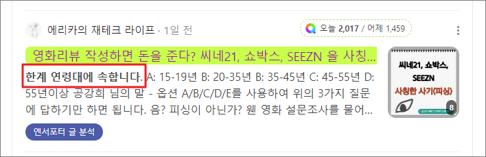 이번에 제가 작성한 '영화리뷰 작성하면 돈을 준다? 씨네21, 쇼박스, SEEZN 을 사칭한 사기(피싱)를 당했어요.'를 보더라도