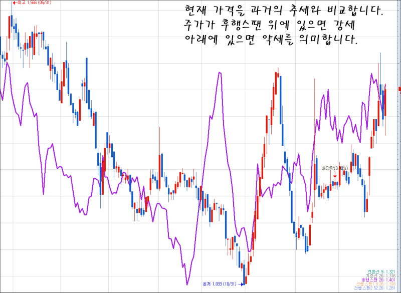 주가가 후행스팬 위에 있으면 강세, 아래에 있으면 약세를 의미합니다.