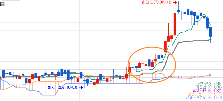 이처럼 선행스팬으로 매수타이밍과 지지점을 확인할 수 있고
