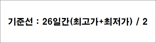 기준선은 중기 이동평균선과 유사한 개념으로 당일 포함 과거 26일간의 최고가와 최저가값의 중간값을 이은 선입니다.