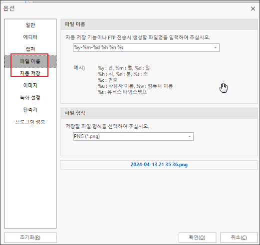 파일이름 탭과 자동저장 탭에서는 캡쳐시 이미지를 자동으로 저장할 것인지 어떤 확장자를 가진 파일로 저장할건지 지정할 수 있어요.