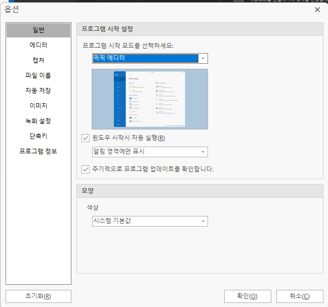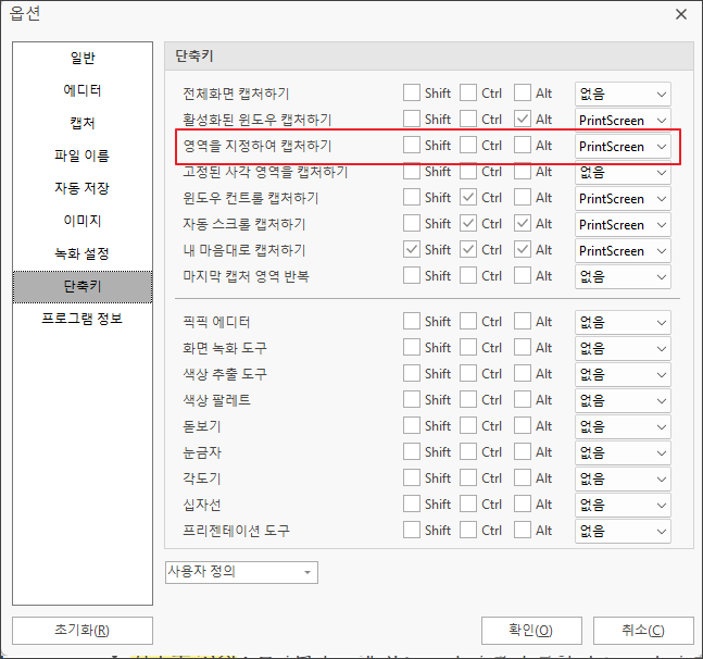 단축키 탭에서는 PrintScreen으로 사용할 키는 저같은 경우 전체화면 캡쳐가 아닌 영역을 지정하여 캡쳐하기로 기본 설정을 해놨습니다.