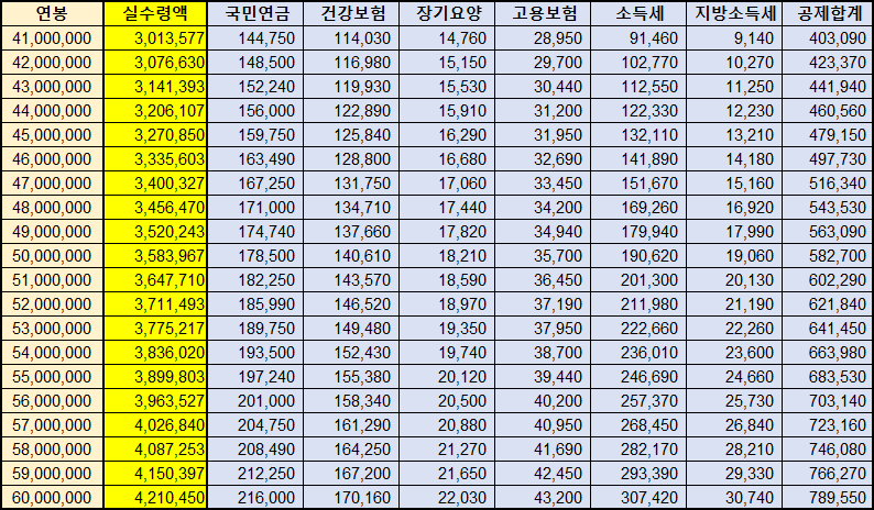 연봉 4천1백~6천만원 연봉 실수령액표