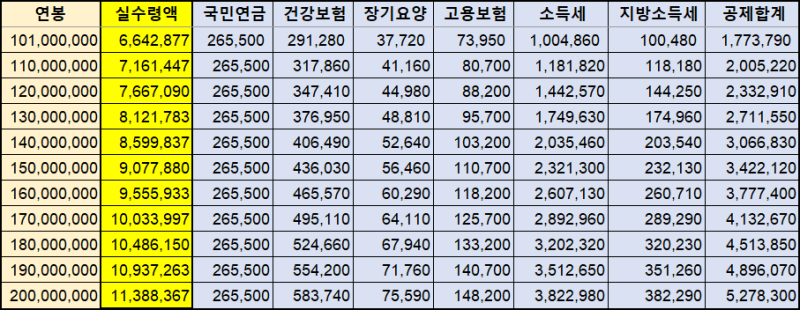 1억1백만원 부터 2억원까지의 2024 연봉 실수령액표 입니다.