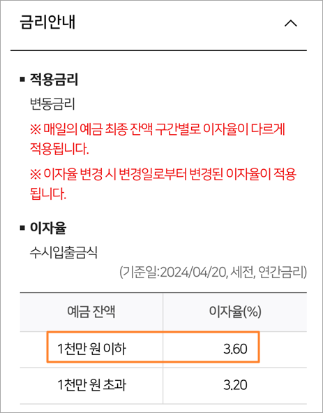 금리가 3.6% 적용되는 수시입출금 상품입니다.