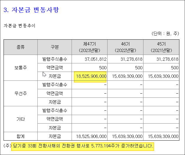 그 이유가 자본금 변동표 아래에 설명이 되어 있는데 전환사채의 전환권 행사 때문으로 되어 있습니다.