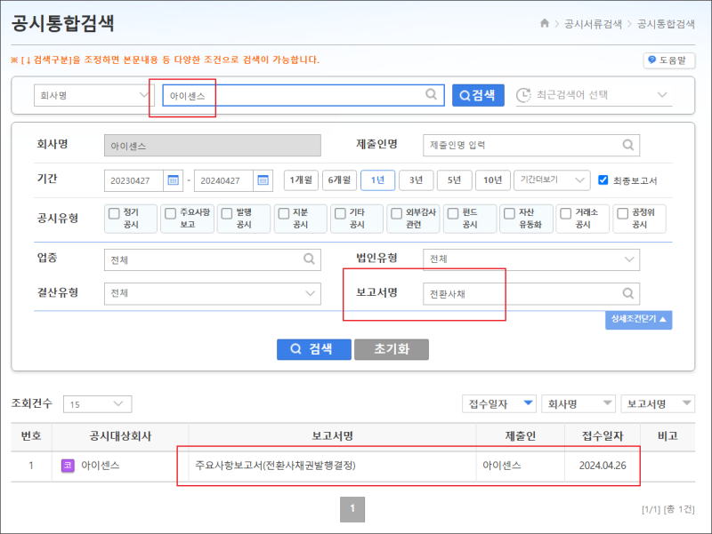 저는 최근 전환사채 발행을 공시한 "아이센스"란 기업을 검색해 볼게요.
