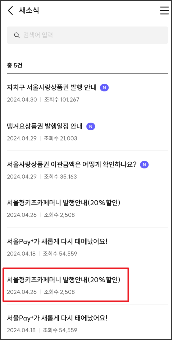 그래서 서울페이 어플에 접속해서 새소식을 보니