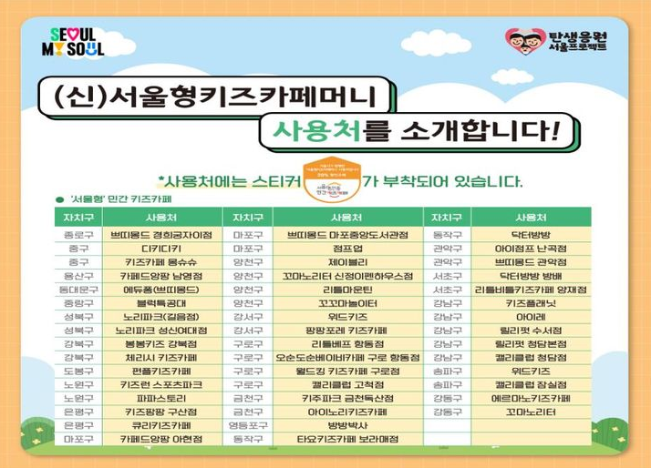 서울시 소재 민간 키즈카페 중 서울형키즈카페머니 사용처로 선정된 키즈카페에서