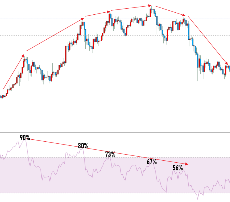 가격이 상승하는 동안 상승 모멘텀이 감소하고 있다는 신호로 해석할 수 있으며, 이는 가격 하락 전환의 가능성을 암시합니다.